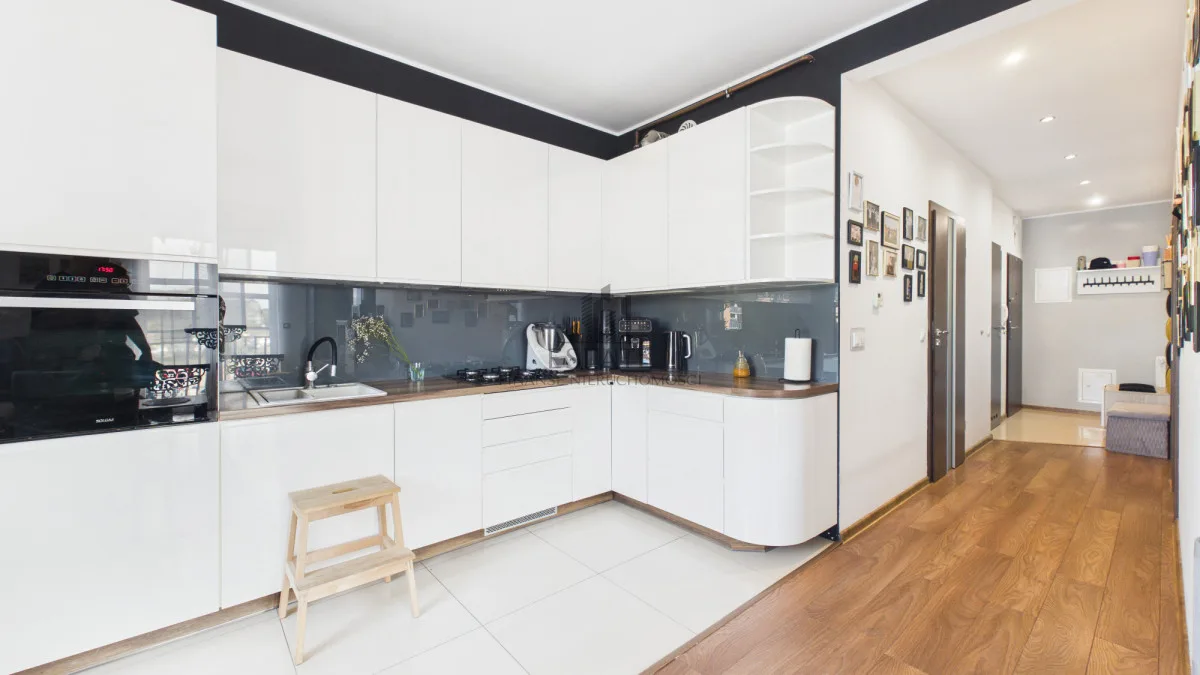 - Ściany: w pokojach gładzie, w łazience i kuchni płytki